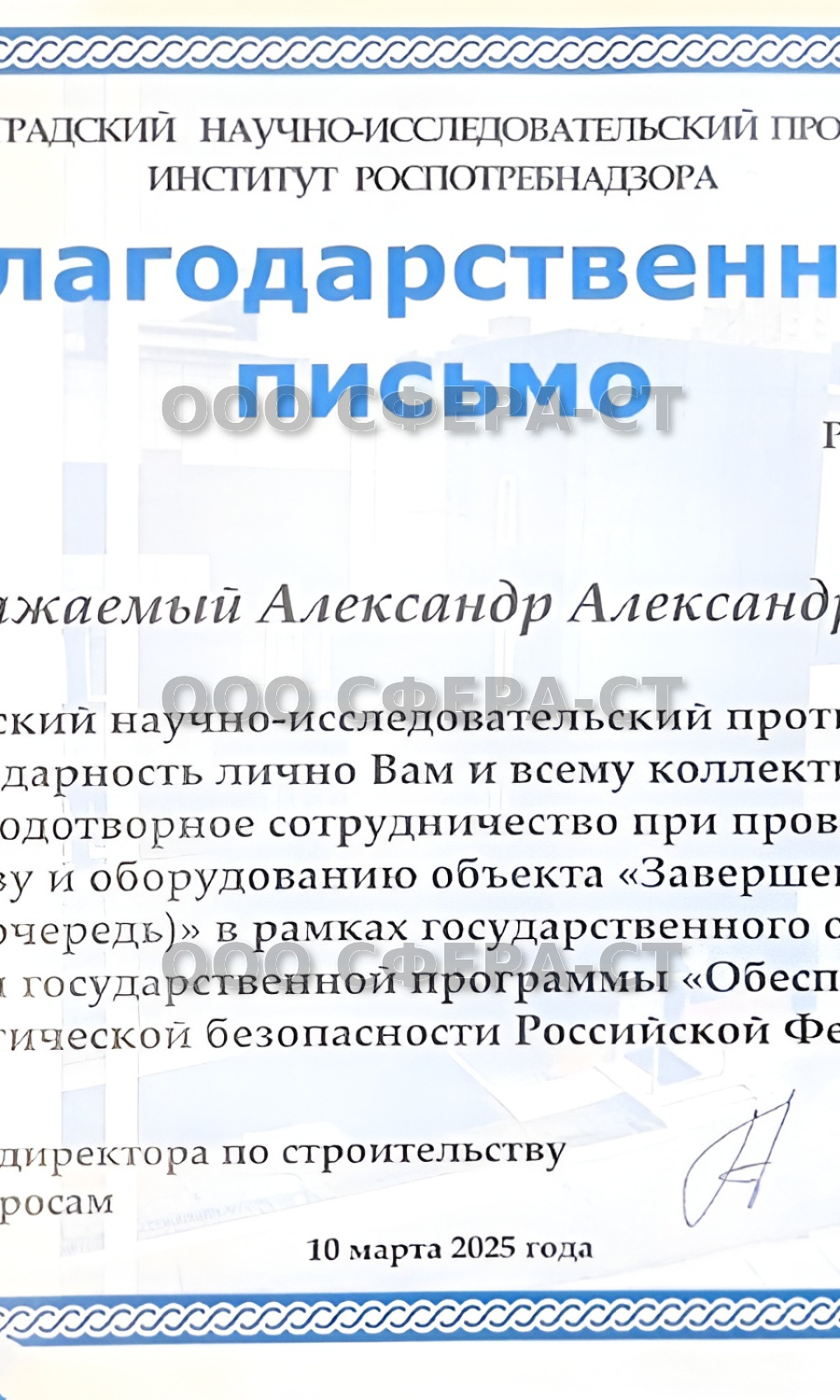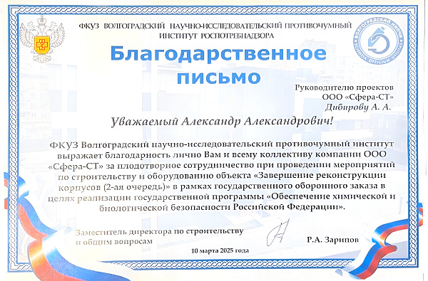 Благодарственное письмо от ФКУЗ Волгоградский научно-исследовательский противочумный институт